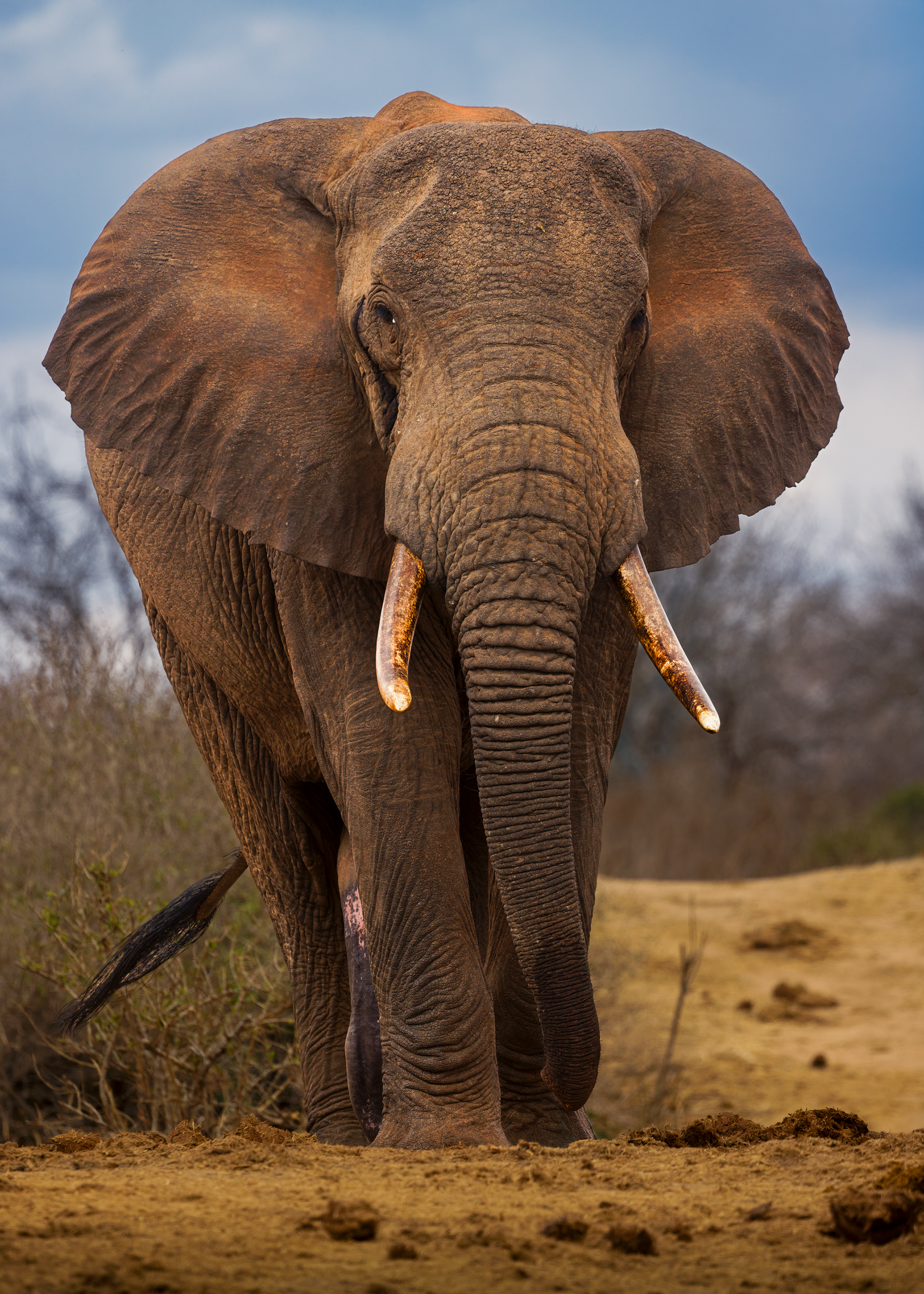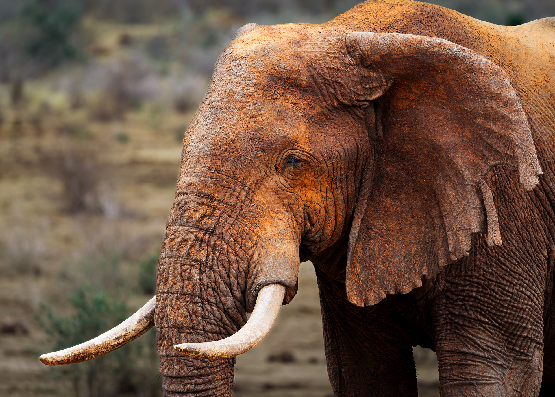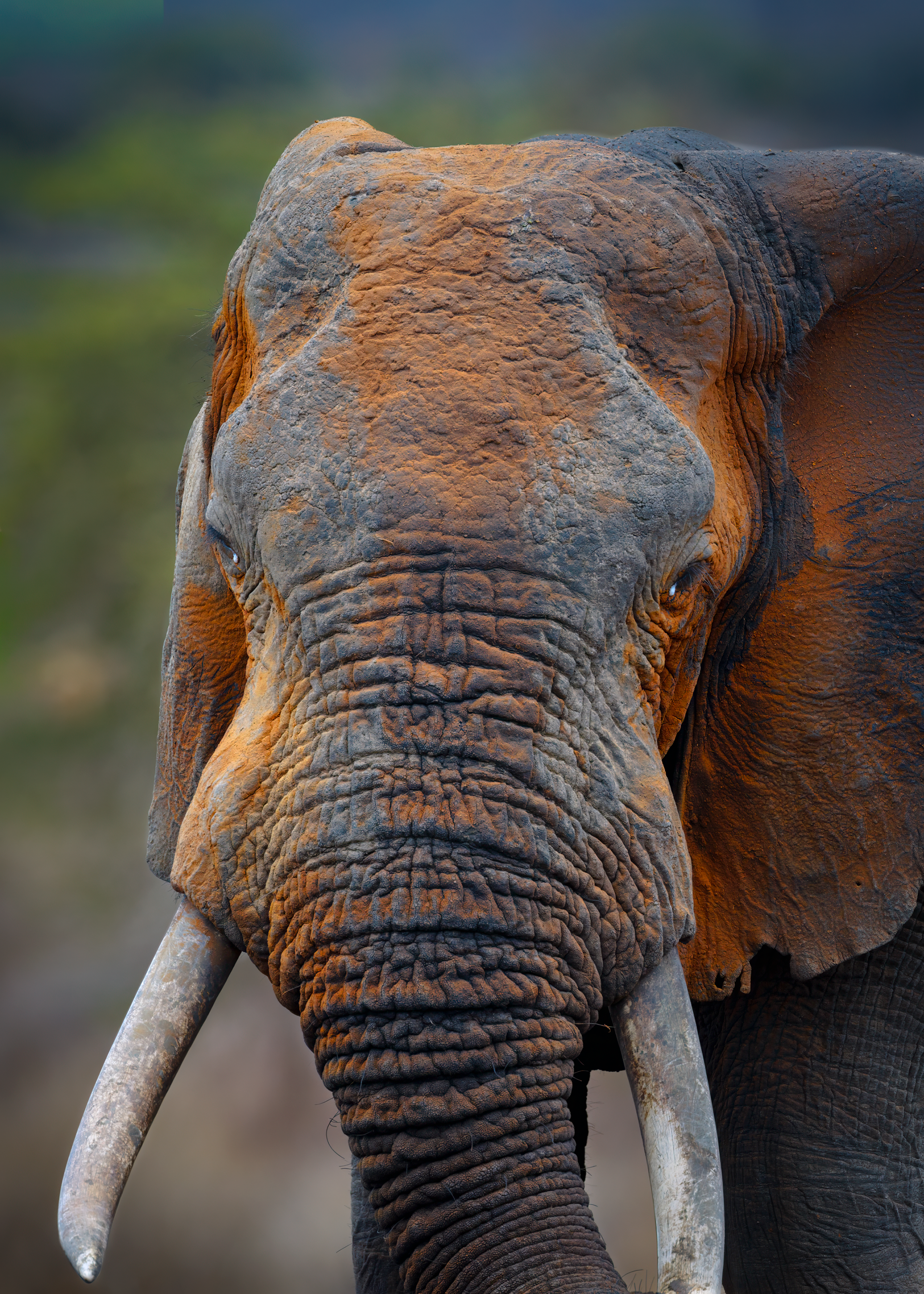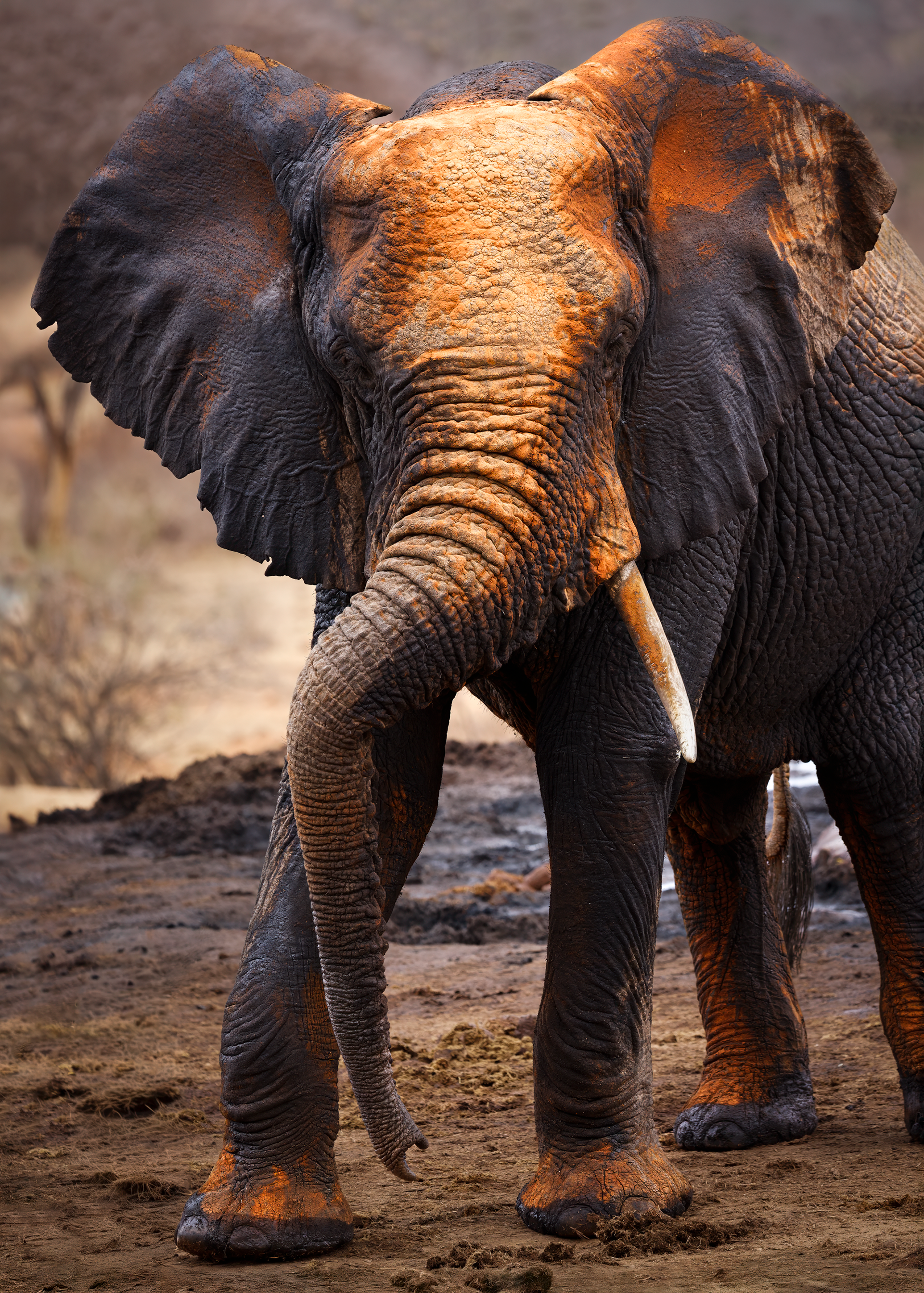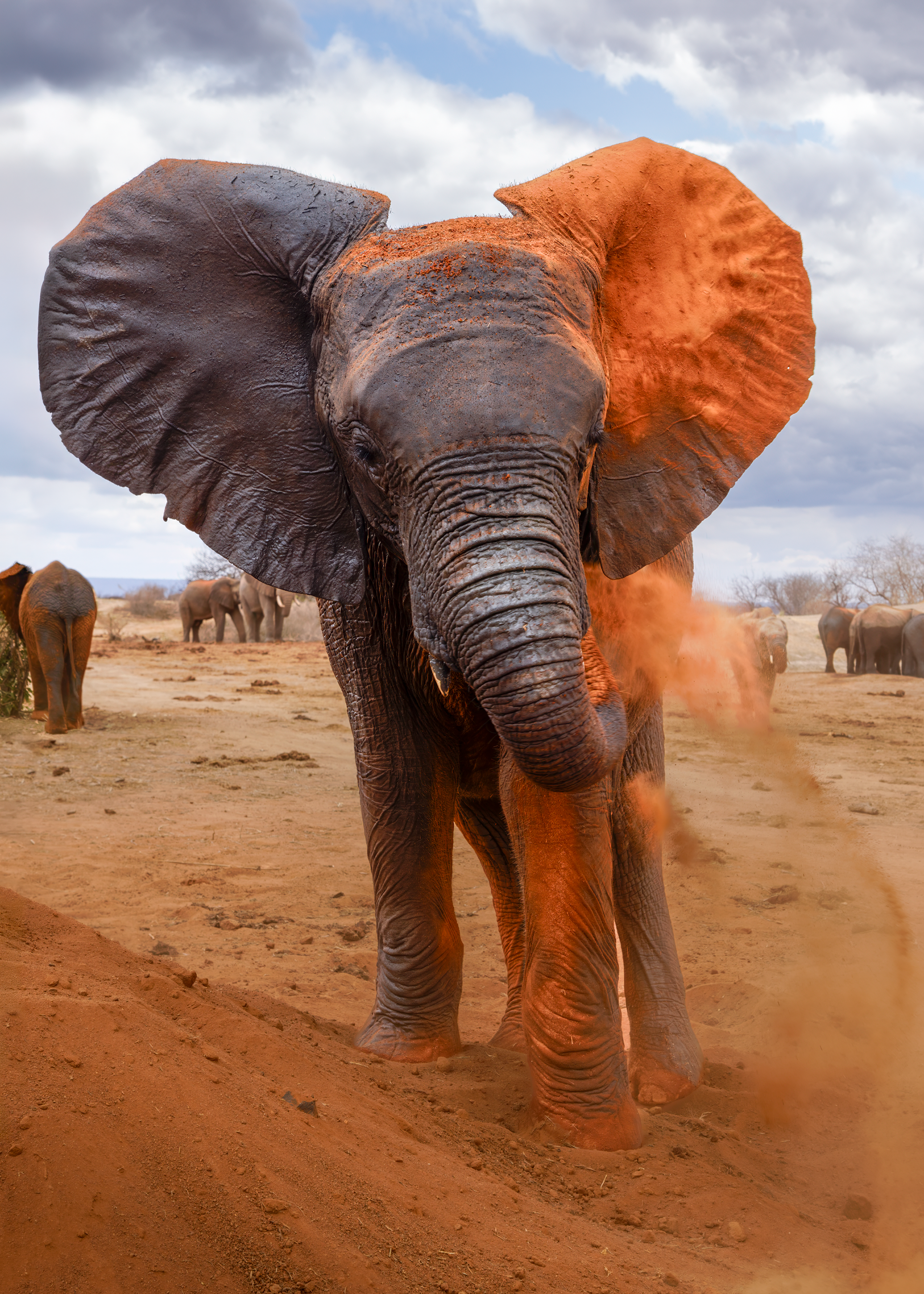 To mitigate the sun and heat, the elephants of Tsavo bathe in a black mud and then throw sand on their bodies as they dry. Depending on the iron content and other properties of the sand, the color varies widely.