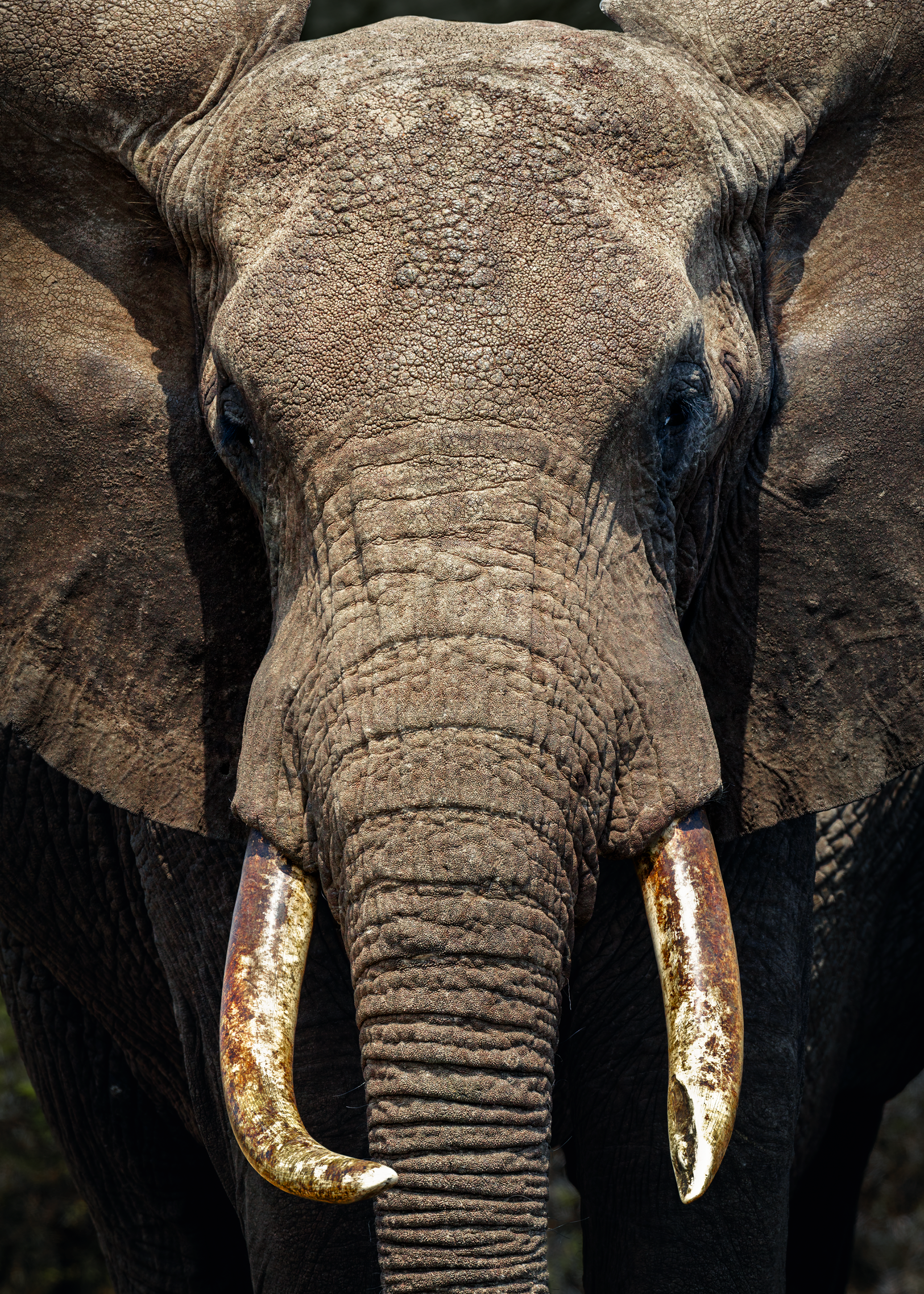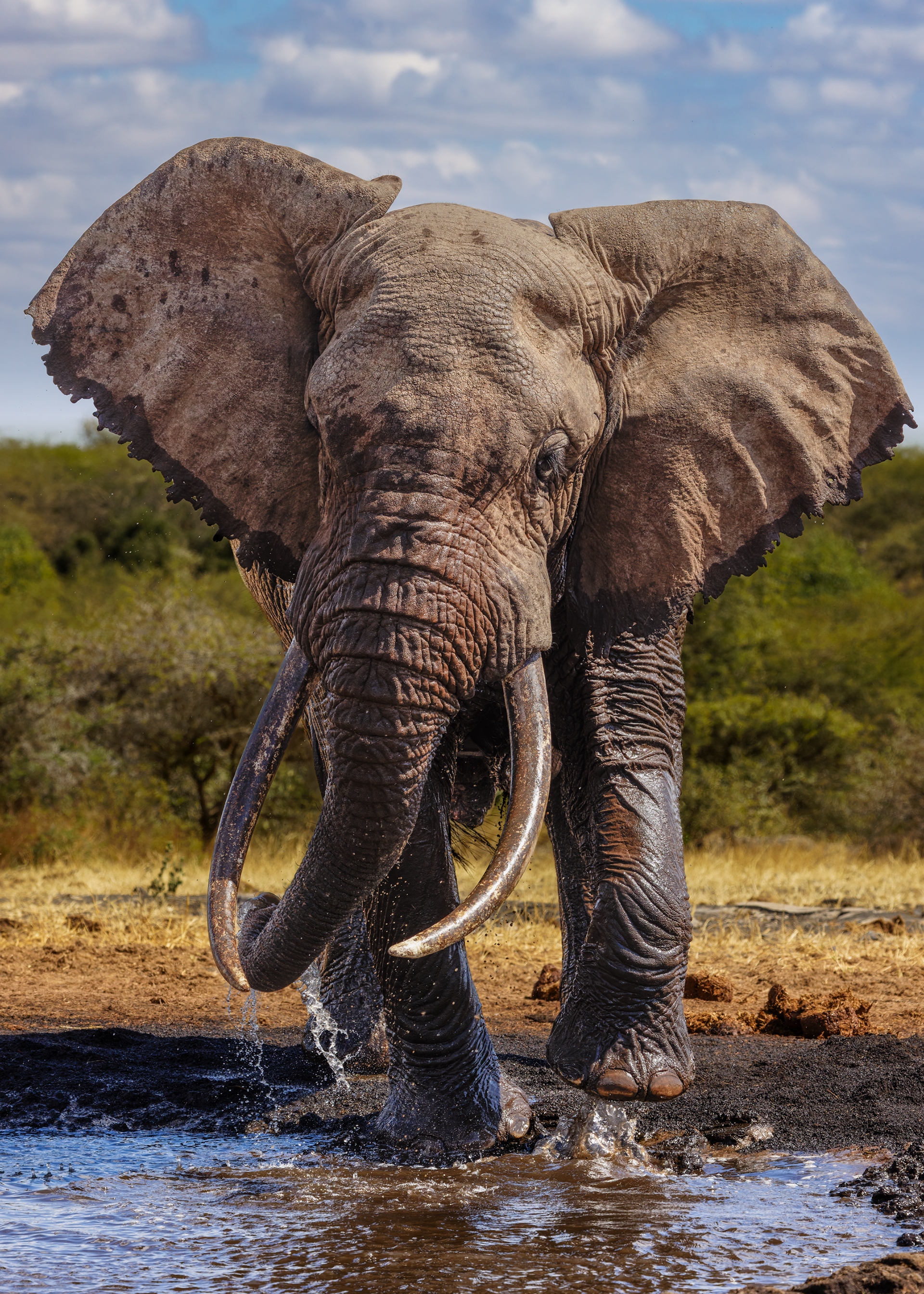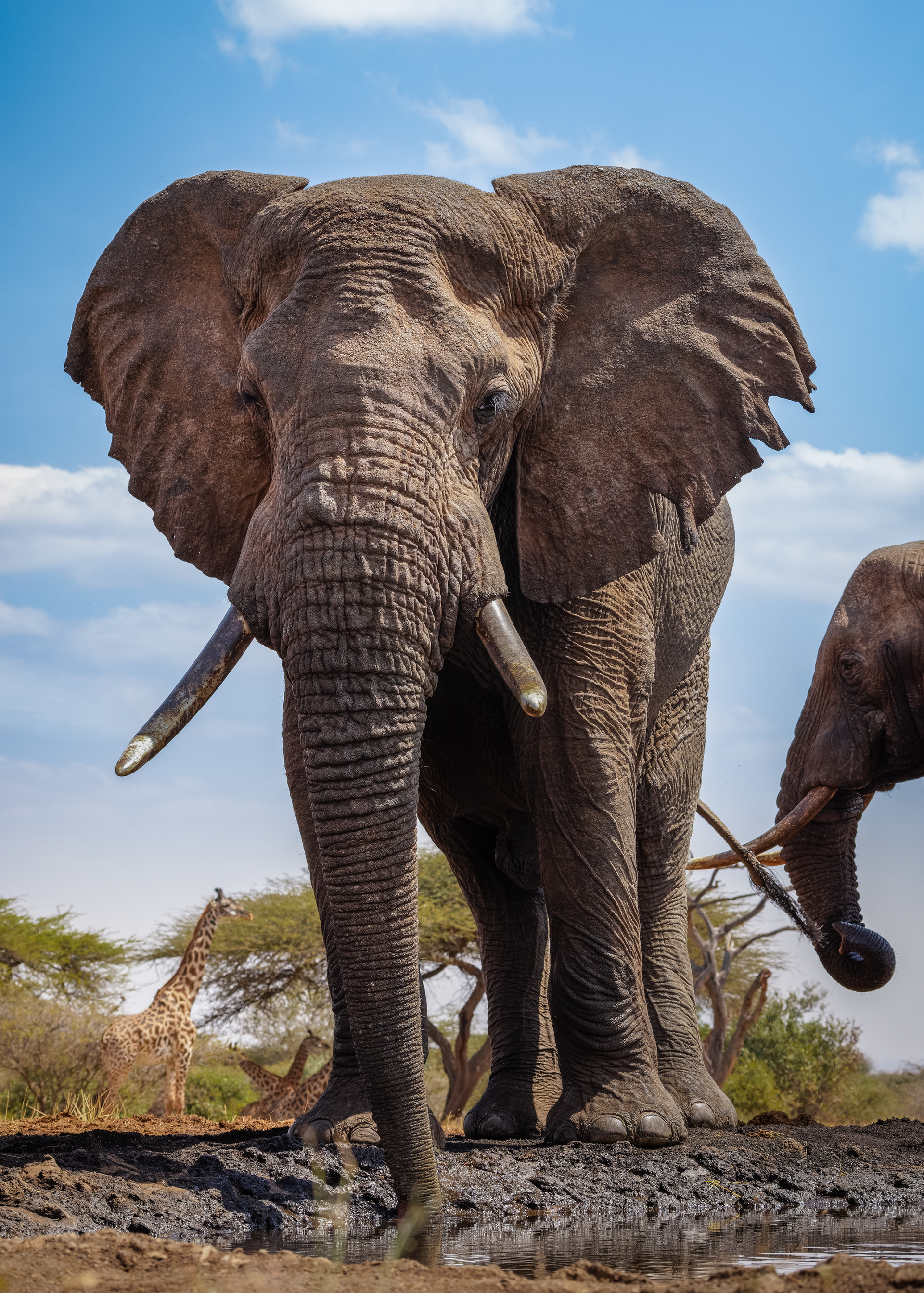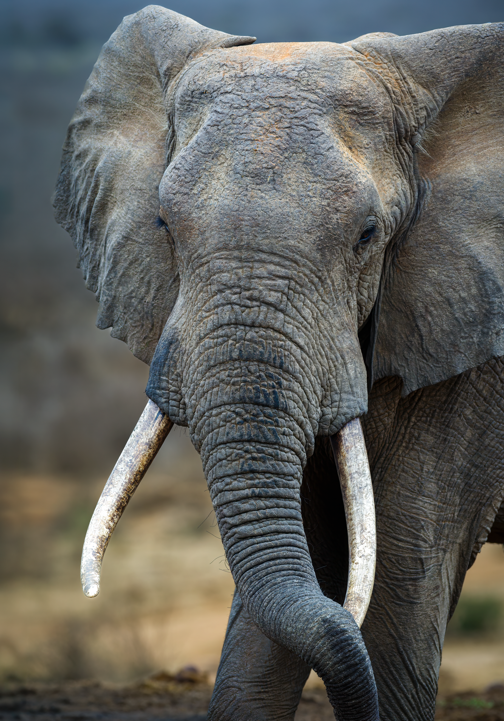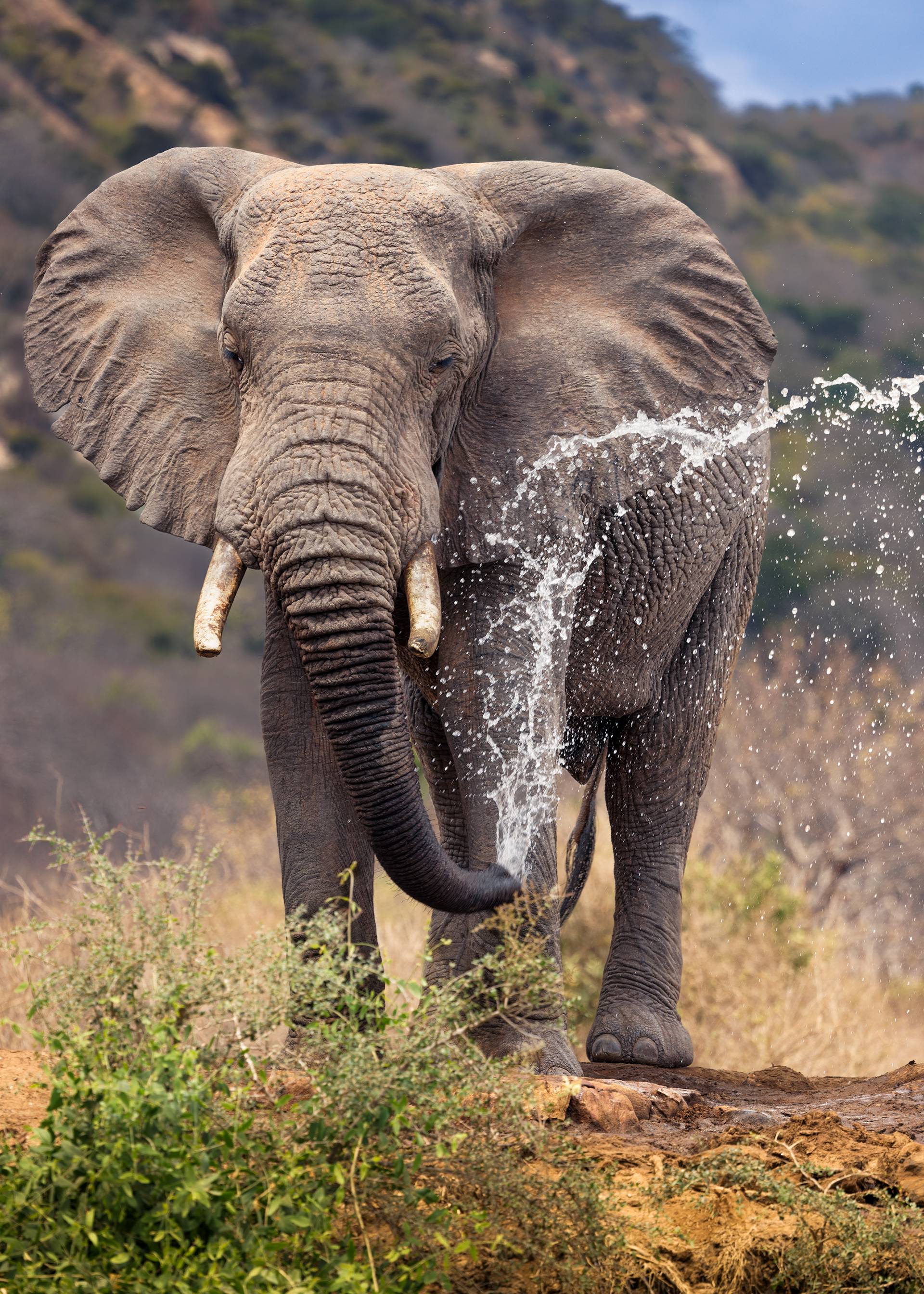 To mitigate the sun and heat, the elephants of Tsavo bathe in a black mud and then throw sand on their bodies as they dry. Depending on the iron content and other properties of the sand, the color varies widely.